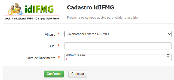 3. Escolha o seu vínculo (Colaborador Externo NAPNEE), digite seu cpf, data de nascimento e clique em Confirmar.